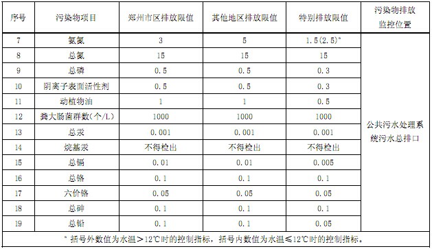 4.1新建公共污水處理系統自2014年6月26日起、鄭州市區現有公共污水處理系統自2016年7月1日起、其他地區現有公共污水處理系統自2016年1月1日起,水污染物基本控制項目排放限值執行表1規定。