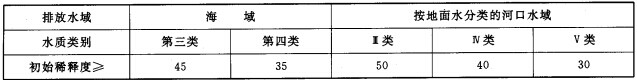 注:對(duì)經(jīng)特批在第二類海域劃出一定范圍設(shè)污水海洋處置排放點(diǎn)的情形,按90%保證率下初始稀釋度應(yīng)≥55。