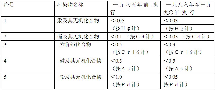 第(1)類:能在環境或支票物體內蓄積,對人體健康產生長遠影響的有害物質,分別控制在車間或車間處理設備排出口,一九八五年前和一九九○年前應執行表1規定的排放標準。必須注意不得用稀釋方法代替必要的處理。