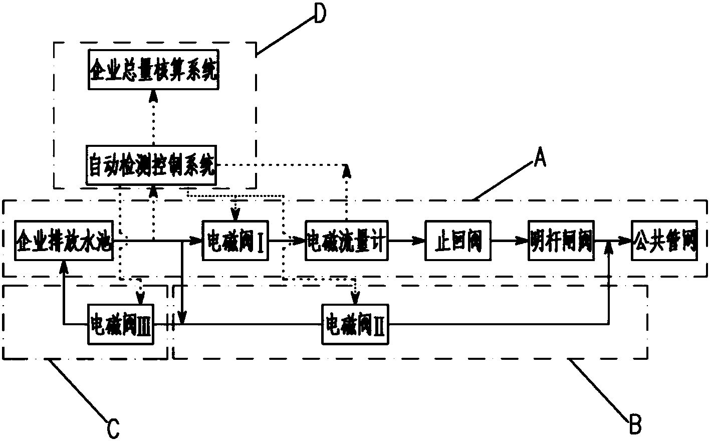 優選地,智能實時控制系統包括自動檢查控制系統和企業總量核算系統,自動檢查控制系統的輸入端分別與企業排放水池的輸出端和電磁流量計連接,自動檢查控制系統的輸出端分別與企業總量核算系統、電磁閥I、電磁閥II和電磁閥III連接。
