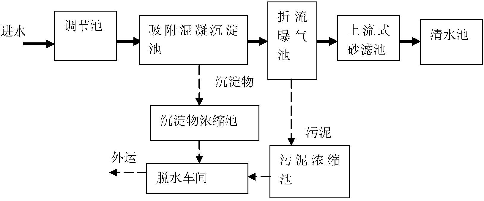 ⑦吸附混凝沉淀池產生的沉淀物和折流曝氣池排出的污泥經濃縮、脫水后外運。