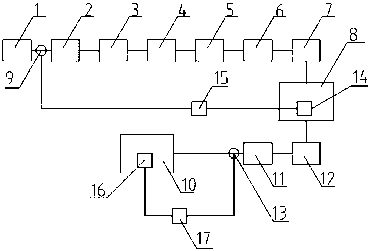 3.根據(jù)權(quán)利要求1所述的一種純水處理系統(tǒng),其特征在于:還包括液位計(jì)二(16),所述液位計(jì)二(16)設(shè)置在回收池(10)中,所述液位計(jì)二(16)通過電磁繼電器二(17)連接至回收泵(13)。