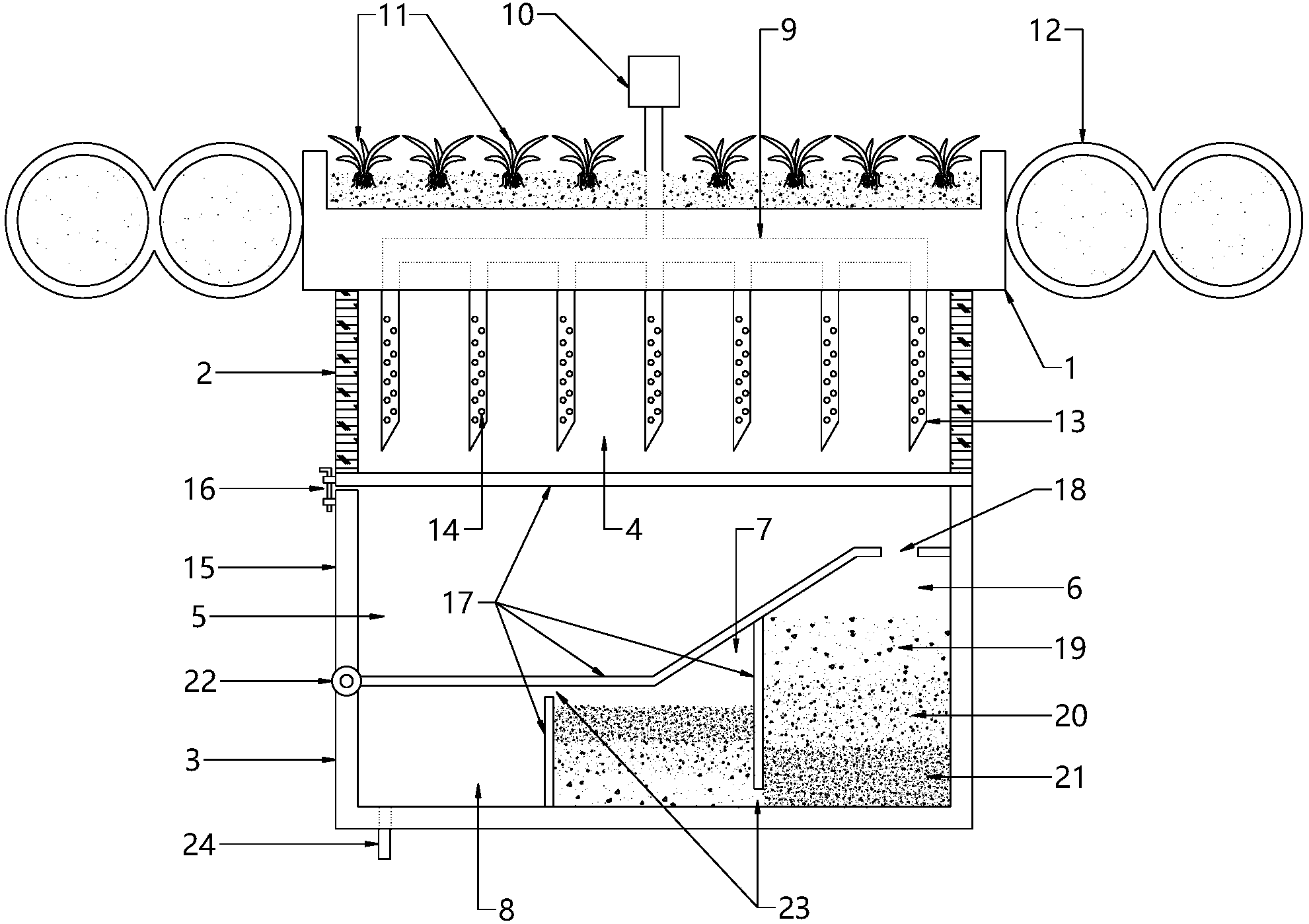 進一步的,所述下流濾室從上到下依次填充有礫石層、粗砂層和細砂層。下流濾室中的礫石層、粗砂層和細砂層主要用于處理COD、溶解性固體、總鐵等,降低上流效率負荷。