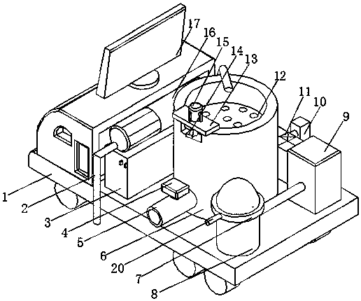1.一種移動式水處理裝置,包括車體(1),其特征在于:所述車體(1)上表面設置有沉淀過濾池(6),所述沉淀過濾池(6)內部設置有過濾網(12),沉淀過濾池(6)上部設置有凹槽,所述凹槽內部設置有絞輪(14),凹槽上方設置有支撐板(13),所述支撐板(13)位于沉淀過濾池(6)上端面,所述支撐板(13)上表面設置有第二驅動電機(15),所述第二驅動電機(15)輸出軸和絞輪(14)轉軸通過鍵連接,且所述沉淀過濾池(6)下部設置有排污口(5),所述排污口(5)處設置有閥門(4),且所述沉淀過濾池(6)一側設置有蓄電池(3),所述車體(1)駕駛室上表面設置有太陽能電池板(17),所述太陽能電池板(17)通過逆變器與蓄電池(3)電連接,所述蓄電池(3)上方設置有吸水裝置(16),所述吸水裝置(16)內部設置有動力裝置,且所述吸水裝置(16)出水端通過水管(2)與沉淀過濾池(6)頂端進水口連接,且所述沉淀過濾池(6)中部側面上設置有出水口,所述出水口通過水管(2)與水泵(11)進水口連接,所述水泵(11)轉軸通過鍵和第一驅動電機(10)輸出軸連接,水泵(11)出水口通過水管(2)與生物處理池(9)進水口連接,所述生物處理池(9)出水口通過水管(2)和蒸發罐(8)進水口連接,所述生物處理池(9)和蒸發罐(8)均位于車體(1)上表面,蒸發罐(8)內部設置有加熱裝置(19),蒸發罐(8)上部設置有收集盤(7),所述收集盤(7)上開有環形槽(18),所述環形槽(18)上設置有凈水出口(20),并且蓄電池(3)與車體(1)控制室內的控制器電連接,控制器分別與吸水裝置(16)內的動力裝置、第一驅動電機(10)、第二驅動電機(15)和加熱裝置(19)電連接。