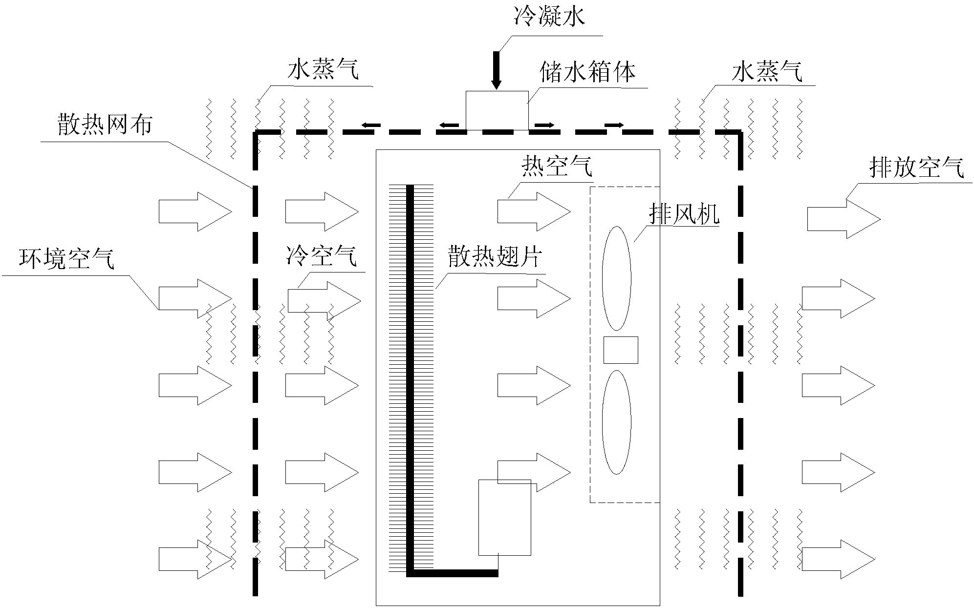 三、通過流動空氣使冷凝水擴散蒸發單元上的低溫冷凝水迅速蒸發,蒸發 的過程中帶走大量的熱量,降低進入散熱器翅片的空氣溫度,從而提高了散熱 效率;