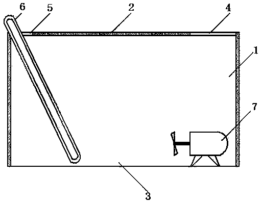 1.一種污水池的格柵除污機,由污水池、格柵除污機和潛水攪拌推進器組成,其特征是:污水池為有池蓋的半封閉式結構,池蓋的一側有污物輸出口,另一側有檢查檢修進出口;格柵除污機分為除污面和回轉面,除污面朝向污水池的另一側傾斜安裝在污物輸出口和池底部之間;潛水攪拌推進器包括潛水電機和攪拌推進槳葉,潛水攪拌推進器安裝在格柵除污機對面側的池底部,攪拌推進槳葉的推進方向朝向格柵除污機的除污面。