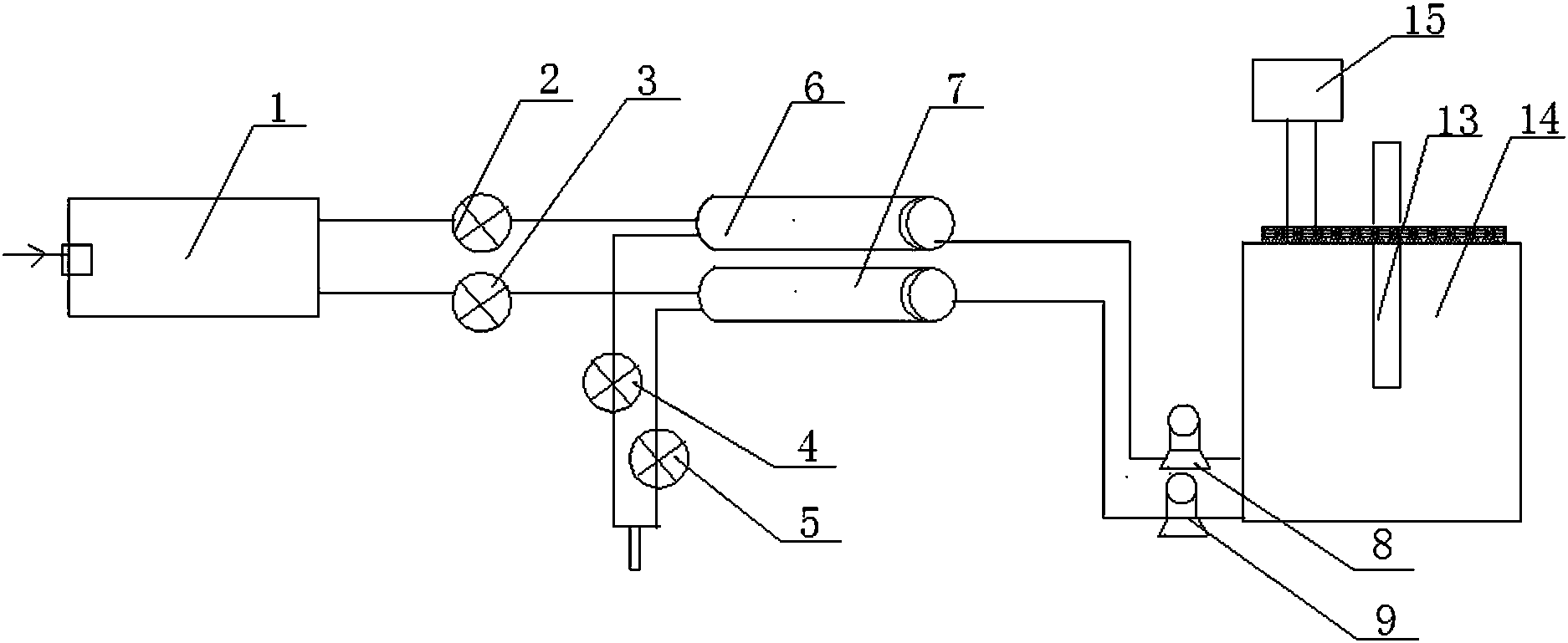 1.一種全自動智能污水提升裝置,其特征在于:包括油水分離器(1)、第一進水管路止回閥(2)、第二進水管路止回閥(3)、第一污物分離反沖裝置(6)、第二污物分離反沖裝置(7)和集水箱(14),所述油水分離器(1)通過進水管路分別與第一進水管路止回閥(2)、第二進水管路止回閥(3)連接,第一進水管路止回閥(2)與第一污物分離反沖裝置(6)連接,第二進水管路止回閥(3)與第二污物分離反沖裝置(7)連接,第一污物分離反沖裝置(6)、第二污物分離反沖裝置(7)均與集水箱(14)連接,集水箱(14)上設有可編輯控制器(15)、水位檢測器(13)、與第一污物分離反沖裝置(6)所在管路連通的第一潛水排污泵(8)、與第二污物分離反沖裝置(7)所在管路連通的第二潛水排污泵(9),第一污物分離反沖裝置(6)通過出水管路還連接有第一強排管路止回閥(4),第二污物分離反沖裝置(7)通過出水管路還連接有第二強排管路止回閥(5)。