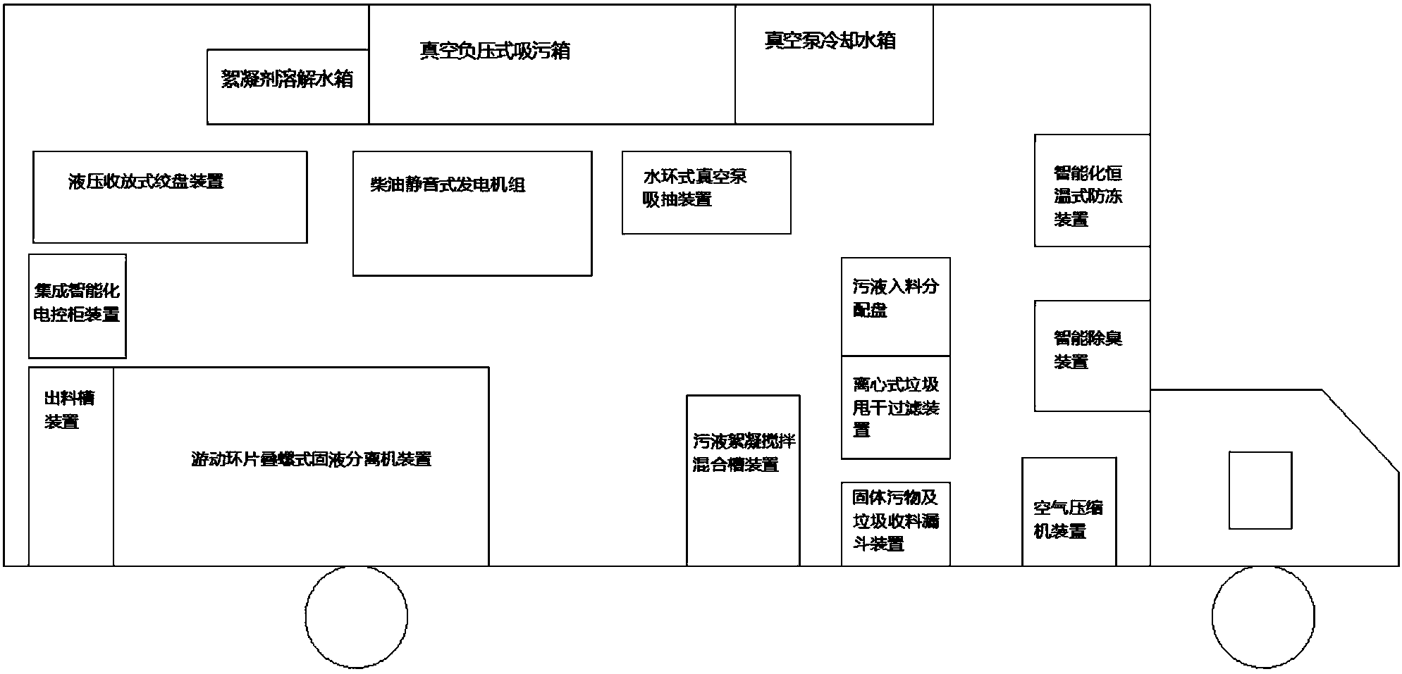 本實用新型設置了可快速拆卸的出料槽裝置,提高可維護性和便攜性;水環式真空泵吸抽裝置好處是,利用水冷方式使工作性能較之前的更加穩定,不至于工作一半因機械溫度過高或夏季工作溫差帶來無吸力的現象;管道與線纜的壓收放式絞盤裝置可避免人工抬管,節約人工成本;柴油靜音發電機給設備提供工作電源時,靜音施工不擾民,且柴油比汽油更加安全;集成智能數控裝置對整車裝備提供智能化、數字化、可視化的操控裝置,其位置調整到箱體后部的出料口處,可省去人工時時監督查看,更加便利,進一步節省人工成本;與集成智能數控裝置連接的各液位控制裝置可對各箱內液體高低位漫溢或排空起自動控制作用;所述智能化恒溫式防凍裝置可使各箱體內的液體不受外界溫度影響,尤其是防止在低溫環境可能造成的箱體及管道堵塞現象,更加適應各種氣候地區;實現了多功能聯動的車載污水處理系統。
