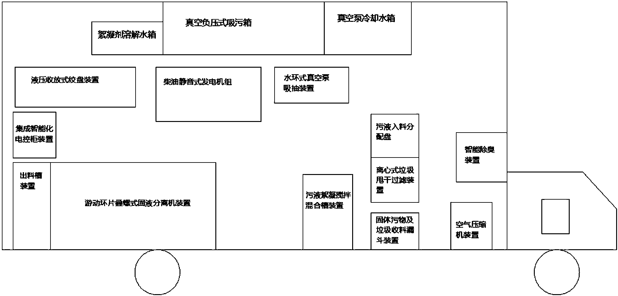 本實(shí)用新型要解決的技術(shù)問題,在于提供一種車載網(wǎng)篩式多功能聯(lián)合污水處理裝置,安裝在車輛的箱體中,所述箱體設(shè)有進(jìn)污口、排污口和出料口,包括絮凝劑溶解水箱、離心式垃圾甩干過濾裝置、真空負(fù)壓式吸污箱、真空泵冷卻水箱、液壓收放式絞盤裝置、柴油靜音式發(fā)電機(jī)組、水環(huán)式真空泵吸抽裝置、出料槽裝置、游動(dòng)環(huán)片疊螺式固液分離機(jī)裝置、污液絮凝攪拌混合槽裝置、空氣壓縮機(jī)裝置、智能除臭裝置和集成智能化電控柜裝置,所述絮凝劑溶解水箱、離心式垃圾甩干過濾裝置、真空負(fù)壓式吸污箱、真空泵冷卻水箱、水環(huán)式真空泵吸抽裝置、游動(dòng)環(huán)片疊螺式固液分離機(jī)裝置和污液絮凝攪拌混合槽裝置通過管道連接,所述出料槽裝置為可拆卸式地安裝在出料口,所述離心式垃圾甩干過濾裝置上設(shè)有污液入料分配盤,所述真空負(fù)壓式吸污箱通過管道與污液入料分配盤連接,所述離心式垃圾甩干過濾裝置的固體出料口連接有固體污物及垃圾收料漏斗裝置。