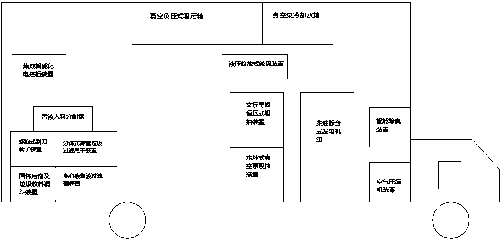 本實用新型設(shè)置了可快速拆卸的固體污物及垃圾收料漏斗裝置,提高可維護性和便攜性;水環(huán)式真空泵吸抽裝置好處是,利用水冷方式使工作性能較之前的更加穩(wěn)定,不至于工作一半因機械溫度過高或夏季工作溫差帶來無吸力的現(xiàn)象;管道與線纜的壓收放式絞盤裝置可避免人工抬管,節(jié)約人工成本;柴油靜音發(fā)電機給設(shè)備提供工作電源時,靜音施工不擾民,且柴油比汽油更加安全;集成智能數(shù)控裝置對整車裝備提供智能化、數(shù)字化、可視化的操控裝置,其位置調(diào)整到箱體后部的出料口處,可省去人工時時監(jiān)督查看,更加便利,進一步節(jié)省人工成本;與集成智能數(shù)控裝置連接的液位控制裝置可對箱內(nèi)液體高低位漫溢或排空起自動控制作用;實現(xiàn)了多功能聯(lián)動的車載污水處理系統(tǒng)。