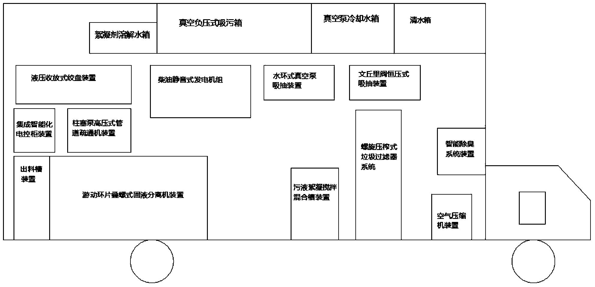 1.一種車載游動環(huán)片式管道疏通及污水處理裝置,安裝在車輛的箱體中,所述箱體設(shè)有進(jìn)污口、排污口和出料口,其特征在于,包括柱塞泵式高壓管道疏通機(jī)裝置,文丘里閥恒壓式吸抽裝置、清水箱、絮凝劑溶解水箱、螺旋壓榨式垃圾過濾器裝置、真空負(fù)壓式吸污箱、真空泵冷卻水箱、液壓收放式絞盤裝置、柴油靜音式發(fā)電機(jī)組、水環(huán)式真空泵吸抽裝置、出料槽裝置、游動環(huán)片疊螺式固液分離機(jī)裝置、污液絮凝攪拌混合槽裝置、空氣壓縮機(jī)裝置、智能除臭裝置和集成智能化電控柜裝置,所述柱塞泵式高壓管道疏通機(jī)裝置,文丘里閥恒壓式吸抽裝置、清水箱、絮凝劑溶解水箱、螺旋壓榨式垃圾過濾器裝置、真空負(fù)壓式吸污箱、真空泵冷卻水箱、水環(huán)式真空泵吸抽裝置、游動環(huán)片疊螺式固液分離機(jī)裝置和污液絮凝攪拌混合槽裝置通過管道連接,所述出料槽裝置為可拆卸式地安裝在出料口。