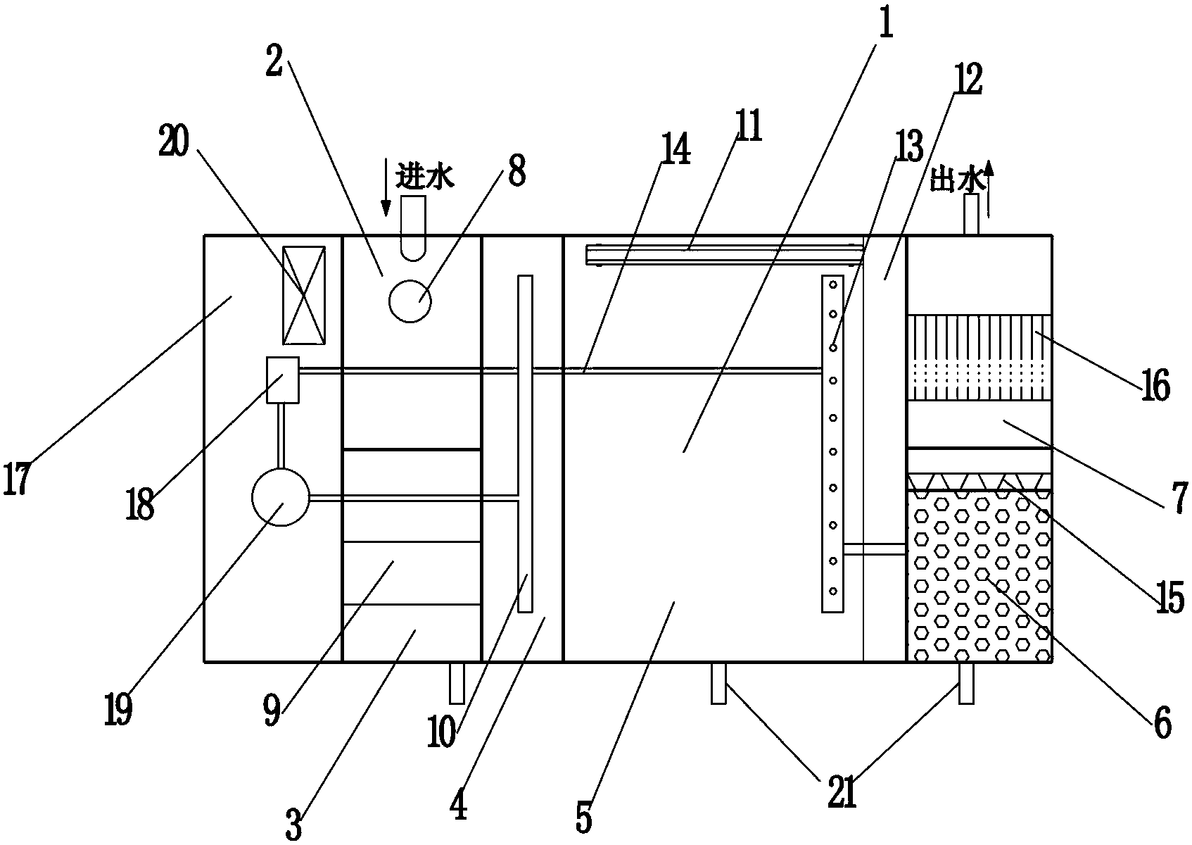 本實用新型通過對一體化景觀水處理裝置內部結構的巧妙設計,和傳統的景觀水處理裝置相比較,有以下幾個特點:
