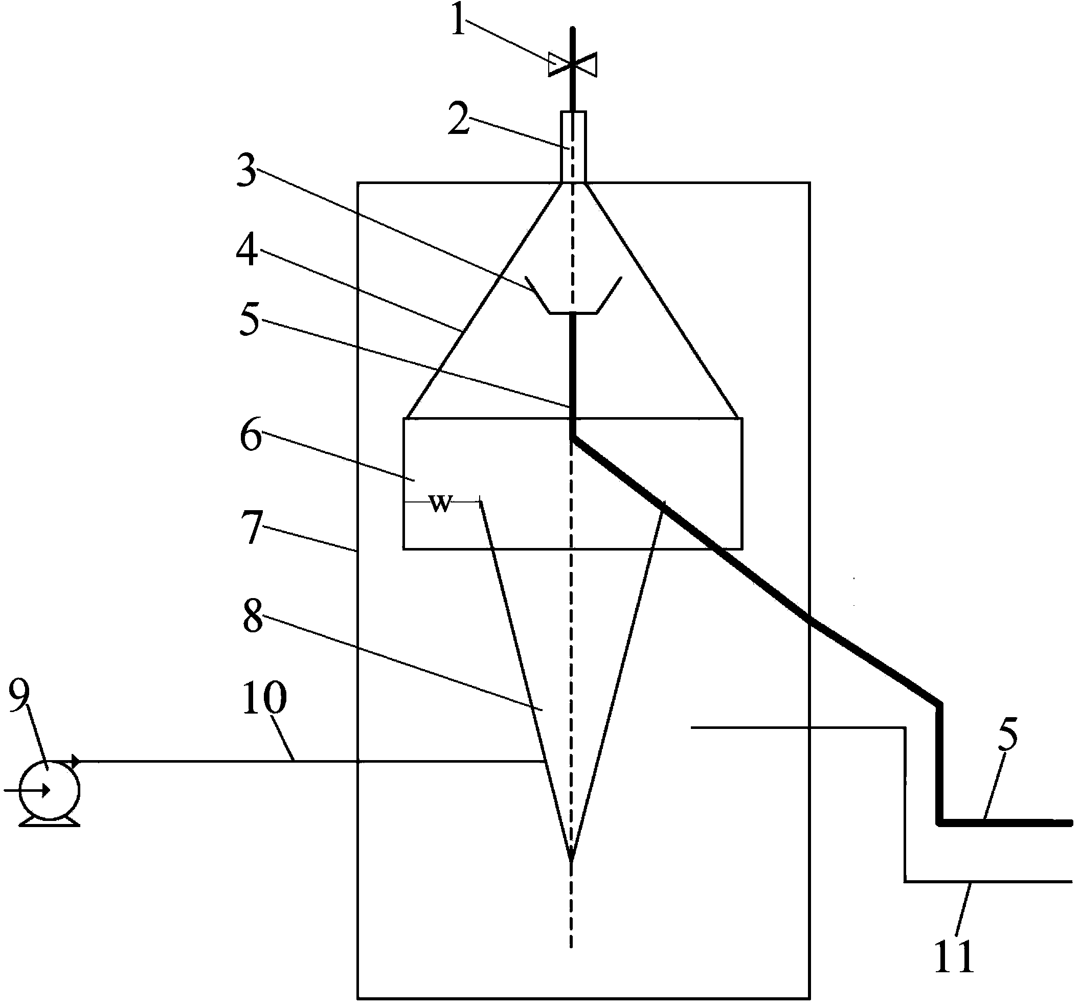 1.一種高含溶解氣污水處理裝置,其特征在于:包括污水輸送泵(9)、污水導流管(10)、氣壓平衡罐(7)、呼吸閥(1)、管狀排氣咀(2)、錐狀污泥集聚罐(4)、收泥槽(3)或收泥碗、出泥管(5)、圓錐狀旋流反應罐(8)、呈圓柱管狀的環形圍堰壁(6)和出水管(11);在氣壓平衡罐(7)罐腔內,錐狀污泥集聚罐(4)固裝在圓錐狀旋流反應罐(8)的上方,錐狀污泥集聚罐(4)具有的尖端豎直朝上且設置有僅連通錐狀污泥集聚罐(4)罐腔的管狀排氣咀(2),氣壓平衡罐(7)頂部罐壁設置有穿透壁體的通孔,管狀排氣咀(2)經該通孔穿過氣壓平衡罐(7)頂部罐壁而伸出至氣壓平衡罐(7)頂面罐壁之外,管狀排氣咀(2)外周壁與通孔周邊相固接密封,在管狀排氣咀(2)伸出至氣壓平衡罐(7)頂面罐壁之外的管口上安裝著呼吸閥(1),圓錐狀旋流反應罐(8)具有的被封閉尖端豎直朝下,圓錐狀旋流反應罐(8)相應僅有的圓形罐口位于其具有的尖端的上方且豎直朝上,在圓錐狀旋流反應罐(8)周壁與氣壓平衡罐(7)周壁之間設置著環形圍堰壁(6),環形圍堰壁(6)與錐狀污泥集聚罐(4)僅有的圓形罐口邊沿相固接而環繞圓錐狀旋流反應罐(8)僅有的圓形罐口,環形圍堰壁(6)與圓錐狀旋流反應罐(8)環繞圓形罐口的周壁之間相應留置有環繞圓錐狀旋流反應罐(8)圓形罐口的圓環形間隙,環形圍堰壁(6)與氣壓平衡罐(7)周壁互不接觸以至環形圍堰壁(6)與氣壓平衡罐(7)周壁留置有圍繞環形圍堰壁(6)的環形間隙,在錐狀污泥集聚罐(4)罐腔內固裝著收泥槽(3)或收泥碗,收泥槽(3)和收泥碗兩者之一與錐狀污泥集聚罐(4)周壁互不接觸以至在收泥槽(3)與錐狀污泥集聚罐(4)周壁之間或收泥碗與錐狀污泥集聚罐(4)周壁之間留置有間隙,在收泥槽(3)底部或收泥碗底部設置著穿透其底部壁體的漏泥孔,漏泥孔與出泥管(5)的一端管口相連接,出泥管(5)的另一端管口穿過氣壓平衡罐(7)罐壁而伸出至氣壓平衡罐(7)之外,氣壓平衡罐(7)其位于環形圍堰壁(6)下方的罐壁設置著穿透其壁體的出水孔,出水孔連通外置于氣壓平衡罐(7)之外的出水管(11);圓錐狀旋流反應罐(8)靠近其尖端的罐壁設置有穿透其壁體的污水進孔,污水輸送泵(9)的出口通過穿過氣壓平衡罐(7)罐壁的污水導流管(10)連通污水進孔;當污水輸送泵(9)將污水依次經污水導流管(10)和污水進孔泵入圓錐狀旋流反應罐(8)罐腔內時,經污水進孔被泵入圓錐狀旋流反應罐(8)罐腔內的污水受污水導流管(10)和污水進孔約束而斜向上噴流,其噴流方向為圓錐狀旋流反應罐(8)軸向正投影所呈現的圓形切線方向;當呼吸閥(1)開啟時,呼吸閥(1)敞開管狀排氣咀(2)以至錐狀污泥集聚罐(4)罐腔依次通過管狀排氣咀(2)和呼吸閥(1)連通氣壓平衡罐(7)外部大氣,當呼吸閥(1)閉合時,呼吸閥(1)封堵管狀排氣咀(2)以至將氣壓平衡罐(7)罐腔與氣壓平衡罐(7)外部大氣封隔開來。