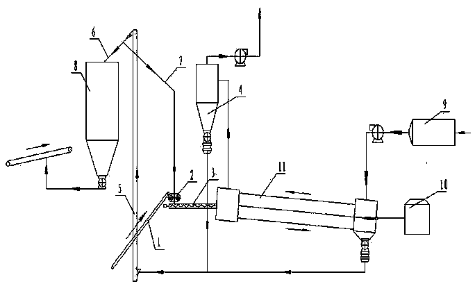 其技術(shù)解決方案如下:一種烘干造紙污泥制備燃料的裝置,包括上料機(jī)、混料裝置、螺旋輸送機(jī)、回轉(zhuǎn)烘干機(jī)、旋風(fēng)收塵器、提升機(jī)、送料管道、回料管道、儲(chǔ)料倉(cāng),所述回轉(zhuǎn)烘干機(jī)的一端分別連通鍋爐除塵器和沼氣源,上料機(jī)、混料裝置、螺旋輸送機(jī)、回轉(zhuǎn)烘干機(jī)順序聯(lián)接,提升機(jī)、送料管道、儲(chǔ)料倉(cāng)順序聯(lián)接,回料管道聯(lián)通儲(chǔ)料倉(cāng)和混料裝置,旋風(fēng)收塵器聯(lián)通回轉(zhuǎn)烘干機(jī)。