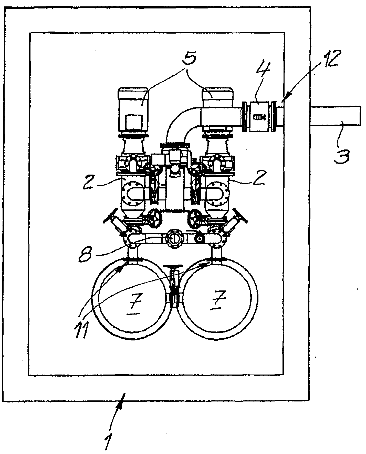 當然也可以在廢水井中在需要時存在多個流體-收集容器或者在結構方面實現多個流體-收集容器。此外,在本發明的范圍內例如分別由阻塞材料-收集容器和泵構成的多個結構單元與流體-收集容器或者多個這種流體-收集容器如所描述地進行結合。由此可以實現例如兩個結構單元的平行運行,從而整體實現壓力和/或量的提高。此外,阻塞材料-收集容器例如也可以與兩個或更多個泵在制造商方面組成預制的結構單元,并且多個阻塞材料-收集容器也可以與一個泵在制造商方面組成預制的結構單元。無論如何,這顯著降低了運輸成本,因為流體-收集容器典型地設計成體積大的并且比較重,并且按本發明在結構方面已經得以實現。