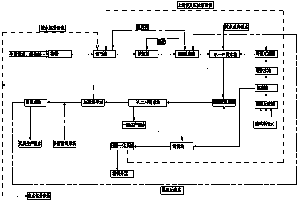 優選地,所述的反滲透單元又連接調節池,經反滲透單元處理后留下的濃水部分回流至調節池中,以重復利用,另外的部分濃水直接用于生產生活。