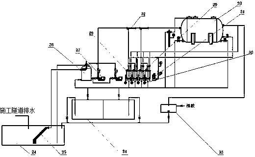 (a)在施工場地建調節池、排泥排水收集池和監督池,調節池用于收集隧道施工排放的污水,開啟真空引水器和提升泵,通過管道將污水由調節池依次引入管式混合器和排水處理單元;