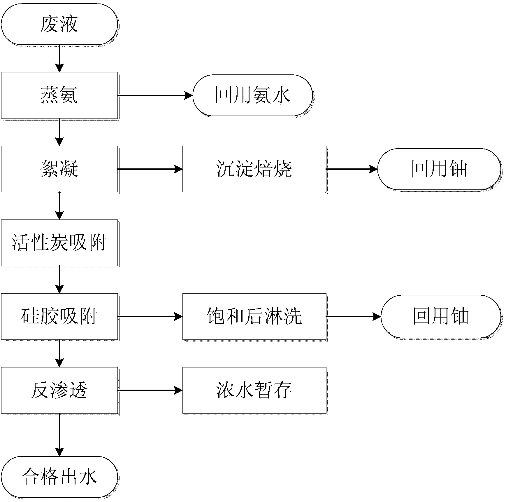 針對本領域存在的問題,本發明的目的是以蒸氨-絮凝-活性炭吸 附-硅膠吸附-反滲透技術為核心的高溫氣冷堆燃料元件核芯制備工 藝廢水處理方法。