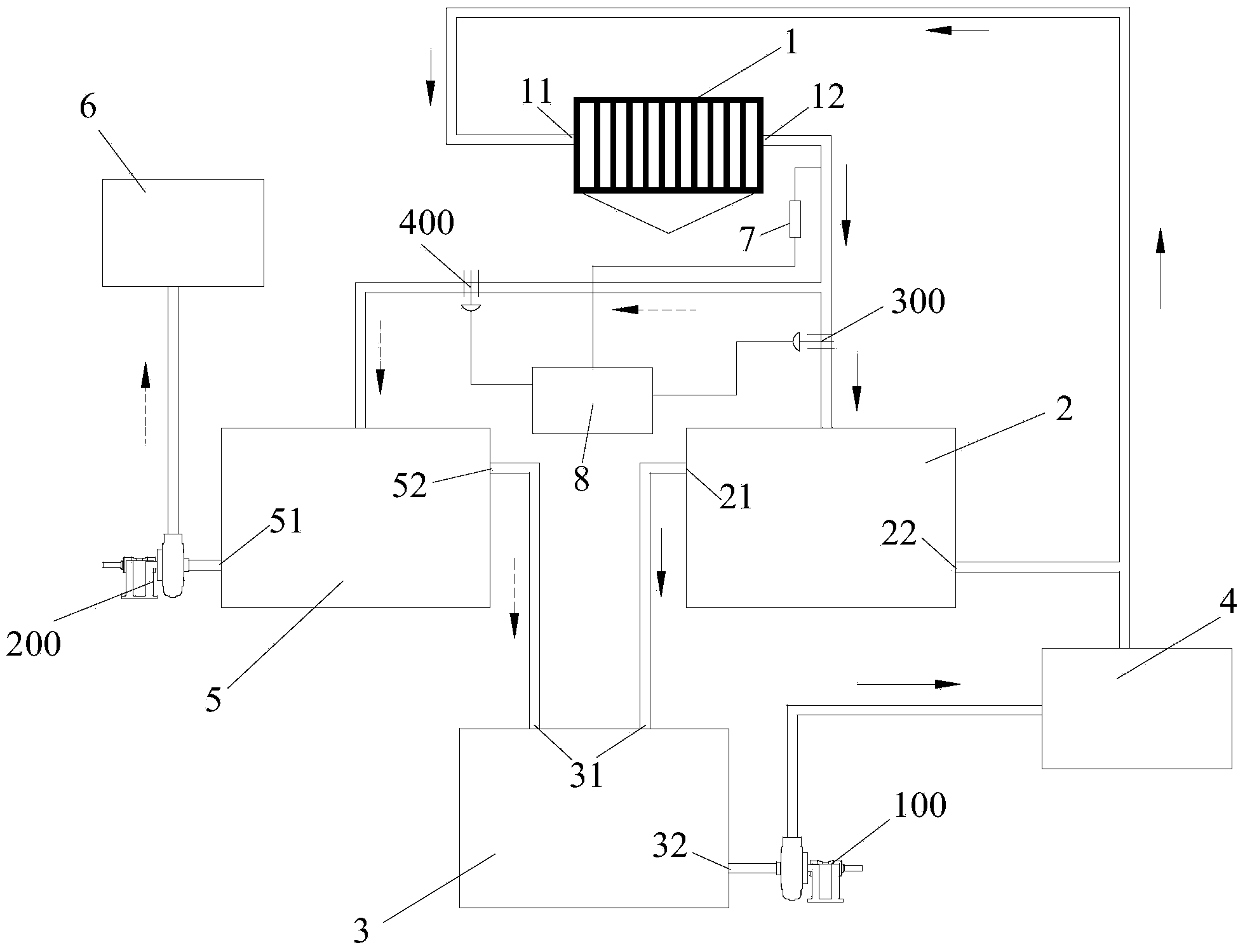 在工業(yè)生產(chǎn)中,為了節(jié)約水資源,并且減少廢水排放量,需要將廢 水處理回收利用。如在洗煤過程中,需要耗費大量的水,同時產(chǎn)生大量 的泥煤水,這些泥煤水都會通過相應(yīng)地處理系統(tǒng)循環(huán)利用。目前常采用 板框壓濾機作為脫水設(shè)備。如圖1所示。現(xiàn)有技術(shù)中回收利用板框壓濾 機的濾液水的方法主要是先將洗煤產(chǎn)生的泥煤水輸入板框壓濾機1′,經(jīng) 過板框壓濾機1′過濾后,將濾液水排入一個沉淀池2′進行沉降澄清,再 將沉淀澄清的濾液水傳入循環(huán)池3′中,通過循環(huán)水泵100′供向外部的洗 煤系統(tǒng)4′使用,如脫泥水、脫介水或清掃水使用。外部洗煤系統(tǒng)4′洗煤 后產(chǎn)生的煤泥水經(jīng)過洗煤系統(tǒng)分級后,產(chǎn)生的細顆粒煤泥水傳入板框壓 濾機1′進水端,再一次進行過濾回收利用,從而實現(xiàn)洗煤水的循環(huán)利用。
