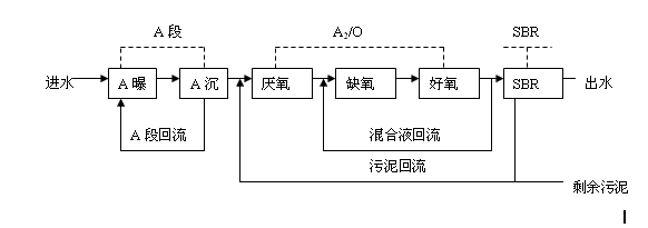 該工藝實質是AB工藝、A2/O工藝與SBR系統串聯而成,采用單池多格方式,省去諸多閥門儀表,增加了污泥回流,又保證了較高的污泥濃度,有良好的脫磷除氮作用。
