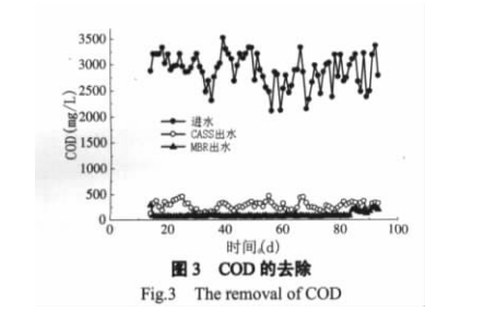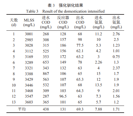 從 4 月 18 日~4 月 30 日,取 CASS 排放水進行實驗,污泥取自 CASS 池,,強化訓化結果見表 3。由表 3 可知,平均進水 COD 為 438mg/L,MBR 出水