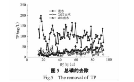 MBR 中試結果表明:污泥濃度控制在 7000~9700mg/L、溶解氧 2~3mg/L 時,HRT 可縮短到 2d,與 CASS 水力停留時間相比縮短了 3d, 但出水COD 仍維持在一較低水平,平均值為 79mg/L,平均去除率為 97%。MBR 工藝中硝化菌的富集強化了氨氮的去除,但因實驗在不排泥條件下進行,使得硝化菌活性降低,導致出水氨氮偏高,在保證硝化菌活性階段,平均值為 1.6mg/L;MBR 工藝較 CASS 工藝具有更優的除磷性能,但除磷性能是有限的,說明在 MBR 工藝應用中除適當排泥外,還應考慮用化學方法以實現更優的脫磷效果。