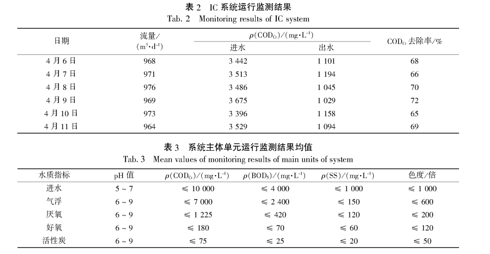 該工藝穩定成熟、運行可靠、管理方便、自動化程度高,經過調試,系統運行效果良好,各項水質達到排放標準,IC系統運行監測數據見表2,各主體單元運行結果見表3。