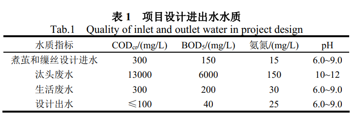 本工程廢水具有繅絲工業廢水的典型特點,考慮企業今后發展,經與該公司溝通后,廢水處理工程設計處理水量為 580 m3/d,其中煮繭和繅絲廢水 500 m3/d,汰頭廢水為 60 m3/d,生活廢水 20m3/d。經過初期檢測,企業煮繭和繅絲廢水 CODcr 為 150~289mg/L,汰頭廢水 CODcr 為 9800~11000 mg/L,生活污水 CODcr小于 300 mg/L,故設計進出水水質如表 1 所示: