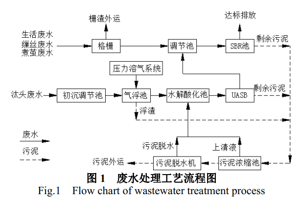 綜合以上分析,本工程設計借鑒同類繅絲生產企業項目廢水處理設計實例,采用“氣浮-水解酸化-UASB-SBR”為主體的處理工藝,具體的工藝流程圖見圖 1 所示: