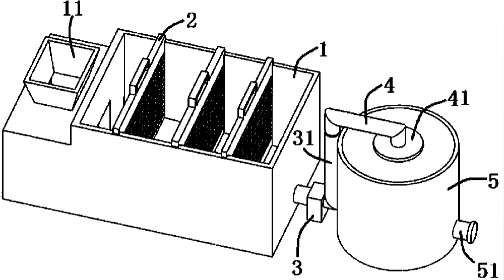 所述過濾組件包括外殼1、過濾件2以及排水管、水泵3,所述外殼1為上端敞口的矩形盒狀,外殼1的前端設有進液口11,外殼的后端為過濾室,且進液口11與過濾室通過斜向設置的通道連通,外殼1相對兩側板的內壁上對應分布有插接槽;