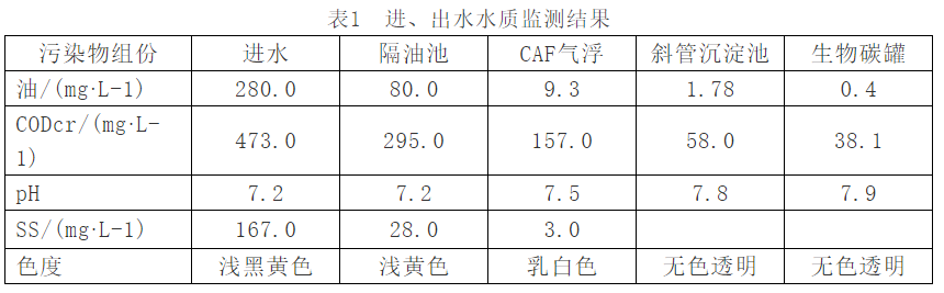 深度處理采用壓力濾器+生物碳聯合處理工藝。壓力濾器中填料為石英砂與無煙煤雙層濾料,在去除懸浮物的同時,對油亦有較高的去除率,實際運行結果表明,在進水含油量低于10mg/L的情況下,其出水含油量始終穩定在1.0mg/L左右。生物碳罐中填料為顆粒活性炭,并在其底部通入空氣,經過濾后的廢水通過活性炭的吸附及其表面生長繁殖的微生物的生化降解作用進一步降低回用水中的COD及有機物,最終出水油均低于0.5mg/L。