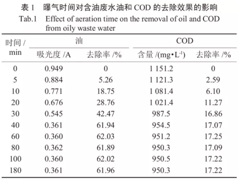 由表1可知,曝氣處理過程對降低含油廢水中油和COD的含量具有一定的處理效果,其中對油的去除效果較為顯著。在曝氣處理40min時,廢水中的COD約去除17%左右,油的含量約去除62%左右,并且水樣的刺激性氣味明顯減弱。再增加曝氣時間,油和COD的含量幾乎不再發生明顯變化。這主要是因為含油廢水中的溶解在水中的油份主要以揮發性的輕油為主,曝氣作用可以加快揮發性物質的揮發速度。曝氣過程中水中溶解氧增多,一些價態較低的無機物被氧化,同時一些沸點較低的有機物被氣泡攜至水體表面被帶走,使得水中COD含量得到一定的降低。