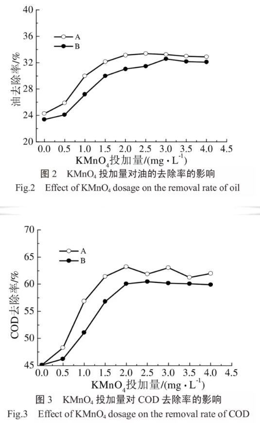 通過前期的燒杯實驗已確定混凝劑PAC的最佳投量為90mg/L,在此混凝劑投量下,控制高錳酸鉀的投加量分別為0.5、1.0、1.5、2.0、2.5、3.0、3.5、4.0mg/L,并采用A、B兩種不同的投加方式:A:在混凝劑PAC之前投加高錳酸鉀;B:在混凝劑PAC之后投加高錳酸鉀。攪拌條件為:先以200r/min攪拌1min,再以100r/min攪拌3min,靜沉20min后,取液面下2cm處的上清液進行分析測試。考察不同投加方式、不同投量的高錳酸鉀對油和COD的去除效果的影響,實驗結果如圖2和圖3所示。