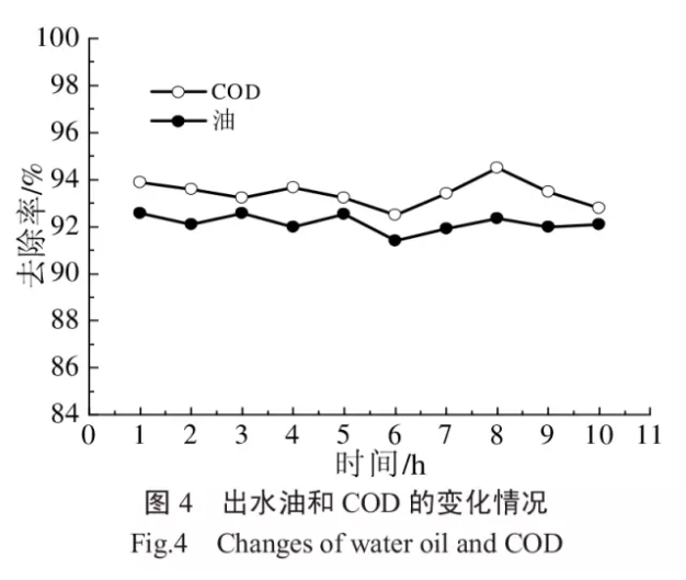 在組合工藝最佳運行條件下,控制陶瓷平板膜膜通量為30L/(m²·h),運行周期為正常運行11min,反洗1min,反沖洗流量為120mL/min,系統連續運行10h,定時對水質進行檢測,考察曝氣/強化混凝/陶瓷膜微濾組合工藝對含油廢水中油和COD的去除效果,結果如圖4所示。