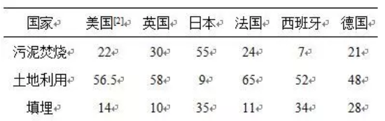 目前國內外污泥處置方法主要有污泥焚燒、衛生填埋、土地利用。表1是污泥常用的處置方法在幾個國家所占比例的對比。