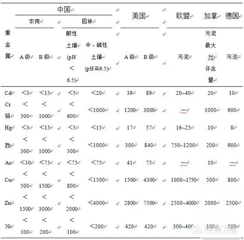 表3我國與其他國家污泥土地利用重金屬標準的對比