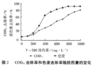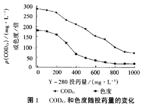 在設計的實驗方法和條件下,固定水樣為1000mL,通過改變Y280的投加量得到不同澄清度的上清液,加藥量與上清液的CODcr、色度之間的關系見圖1和圖2。