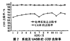 幾個月的運行表明,整個廢水處理系統對COD的去除率較高(99%以上),同時具有較高的耐沖擊能力。