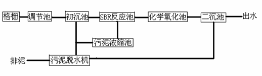 4 工藝的選擇 我們選擇SBR工藝和化學氧化法連用的方法對其污水進行處理。經過反應后出水水質可達到國家廢水綜合排放標準(GB8978-88)三級標準: (1) PH=6~9 工藝優點: SBR相對于連續流系統有許多其它方面的優點。首先,這種反應器運行靈活簡潔。它可以配合不同的進水水質調整運行模式。第二,SBR流態上屬于完全混合,而在有機物降解方面卻是時間上推流。因此為了達到較高去除率而只需調整反應時間。這樣大大減少了占地,特別適合中小型水廠。第三,SBR的沉淀階段使泥水有效分離,出水懸浮物濃度低,無需另設澄清池。第四,SBR工藝很多情況還可不設初沉池,因而基建費用低,占地少。 化學氧化法是利用化學氧化劑的氧化作用將水中的污染物轉化為微毒或無毒的物質,或將其轉化易于分離的形態的處理方法。他最終能實現污染物的無害化處理。其特點為反應速度快,適用范圍廣,可使部分有機物礦化。反應條件溫和,通常對溫度和壓力沒有要求,不需要在強酸強堿介質中進行。由于是一種物理化學處理過程,易于控制,化學氧化法操作簡單,易于設備化。 1.5 流程簡圖 污水經過格柵將大的固體廢物清除掉,進入調節池后由投藥機向污水中加入CaO將PH調到6---9同時控制水量,經過調節后的污水進入初沉池進行沉淀,后進入SBR反應池去除COD,BOD運行6小時后排出污水進入化學氧化池通過化學氧化的方法將污水中的有色物質去除使色度達到要求,最后污水進入二沉池進行進一步處理。SBR反應池產生的污泥進入污泥濃縮池進行濃縮后與沉淀池中產生的污泥一起進入污泥脫水機進行脫水后排出。 二.主要生產設施 處理系統分為一級處理系統、二級處理系統及污泥處理系統,其工藝設計分述如下: 1 一級處理: 1.1 格柵間及進水泵房 格柵間與進水泵房合建,格柵間為鋼筋混凝土結構,內設1臺機械粗格柵,所選格柵為 :XGS500型,傾斜角為75o。并配有柵渣收集、壓榨及輸送等設備相應的設計參數如下: 柵前流速 0.5 m/s; 過柵流速 0.7 m/s; 柵渣 1.0 m3/d 進水泵房平面尺寸為12m×15m(包括格柵間)內設4臺自藕式無堵塞潛污泵,三開一備,泵房內配有電動葫蘆一臺以備檢修。 1.2 調節池 調節池采用耐酸處理: 1.停留時間:18h 2.有效容積:100m3 3.有效水深:5m(超高0.5m) 4.內設JGB-700攪拌機及JY-0.3/0.72 A-1投藥機 1.3 豎式沉淀池 1.數量:1座 2.停留時間:T=1h 3.沉淀池直徑D=3m 4.沉淀池有效水深:h1=2.9m 5.內設提砂機 2 二級處理 2.1 SBR反應池: 反應池為鋼筋混凝土結構: 1.MLSS :3000mg/L 2.停留時間:6h 3.污泥負荷:0.5 BOD5/kg·d 4.有效體積:100m3 5.池高:4.5m(超高0.5m) 6.平面尺寸:5m×5m 7.排水口距池底高度:3.7m 8.內設鼓風機及潷水器 3 化學氧化處理 3.1 化學氧化池 化學氧化池采用耐酸處理: 1.進水時間:0.5h 2.停留時間:0.5h 3.池體體積:10m3 4.池高:3m 5.內設攪拌機及投藥器 4 后處理 4.1 二沉池:豎流式 1.數量:1座 2.停留時間:T=1h 5.沉淀池直徑:D=3.61m 6.沉淀池有效水深:h1=3.1m 10.內設提砂機 5 污泥的處理 5.1 污泥濃縮池 本設計設計2座污泥濃縮池: 1.濃縮污泥量:2.25m3/d含水率約為99% 2.濃縮池容積:5m3 3.池高:2.5m 4.池體直徑:1.07m 5.污泥濃縮后體積:0.375m3/d 通過本設計達到了預定的處理效果,首先廢水經過SBR反應池,池中的微生物將污水中的可生物降解的有機物進行了充分的分解,而不可以生物分解的色素等物質經過化學氧化池中的A,B試劑的氧化作用又被分解了,所以COD去除率達到70%,出水COD為290~350達到了國家廢水綜合排放標準(GB8978-88)三級標準色度去除率可達到95%,出水色度為100左右,達到國家廢水綜合排放標準(GB8978-88)二級標準。 本設計產生的可能產生二次污染的物質干燥后的污泥可以,運送到大型污水處理廠進行統一處理。 同時本設計的流程短,占地面積小,操作達到自動化,最大限度地節省了人力,物力,才力。符合皂素生產廠家資金有限,技術投入較小的要求。適合各皂素生產廠家進行污水處理。 | |||||||||||||||||||||||||||||||||||||||||||||||||||||||||||||||||||||||||||||||||