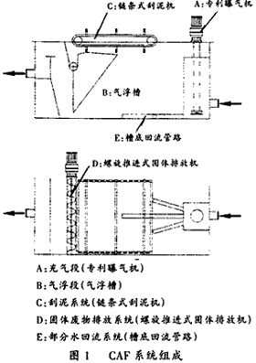 渦凹氣浮(CAF)系統是世界獨創的專利水處理設備,也是美國商務部和環保局的出口推薦技術。CAF是專門為去除工業和城市污水中的油脂、膠狀物及固體懸浮物(SS)而設計的系統。整個氣浮系統共由五部分組成,如圖1所示: