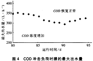 關于膜通量降低的原因可分析如下:COD沖擊負荷使反應器內活性污泥濃度迅速增加,微生物進入生命活動旺盛的對數增長期,細胞繁殖速度加快,MLSS迅速增大說明了這一點。污泥濃度的提高增加了混合液的粘度,從而使液—固分離困難;同時處于對數增長期的污泥活性 高、有大量細胞外聚合物存在[4],增加了膜過濾阻力,也是膜最大出水量降低的原因。