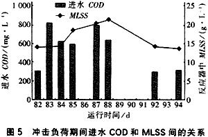 在正常負荷條件下,最大出水量非常緩慢地下降。從裝置開始運行到第83 d,每天平均降低幅度約為0.6 L/d;而當沖擊負荷出現后,最大出水量呈現下降趨勢,大約2d之后,出現大幅度下降,每天平均降低幅度高達7 L/d;當進水負荷正常之后,最大出水量逐步回升。圖5中給出沖擊負荷出現之后反應器內MLSS的變化情況。