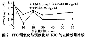 PPC預氧化與預氯化對TOC的去除效果見圖2。
