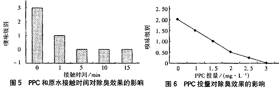 PPC投量及接觸時間對嗅味去除效果的影響見圖5、6。