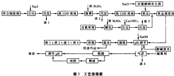 ① 絡(luò)合銅廢液主要是化學(xué)鍍銅廢液,加入Na2S破壞銅絡(luò)合物,使Cu2+形成CuS沉淀去除。除Cu后含COD的出水再做后續(xù)處理。