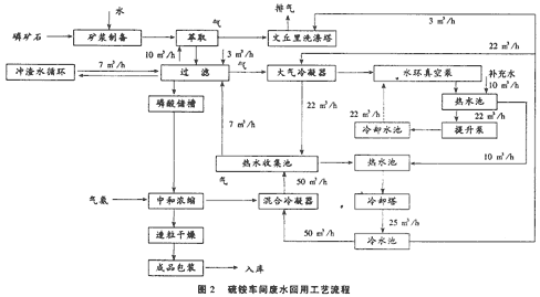磷銨車間含磷酸和磷銨兩個工段。磷酸工段以磷肥車間生產的礦漿和硫酸車間生產的硫酸為原料,經革取、過濾等工序生產磷酸。該工段的廢水主要為文丘里洗滌塔的含氟廢水。用新鮮水作為水環真空泵冷卻水,排水用作大氣冷凝器冷卻水。
