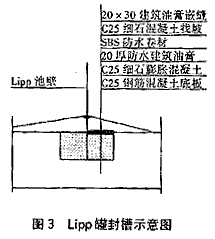 ③厭氧消化罐采用Lipp技術進行卷制。筒體材料采用不銹鋼復合高強度板卷制,在罐頂上部安裝有壓頂槽鋼,采用不銹鋼螺栓與筒體之間的定位,不采用焊接方式。筒體制作完成后,進行罐內的金屬結構安裝。由于罐體為金屬結構,罐頂可在罐內金屬結構完成后再進行安裝,這樣給罐內的安裝工作帶來了極大的便利。厭氧罐內設有布水器,布水器采用枝狀布水,隔3m2設有一個布水頭,布水較為均勻。三相分離器的安裝是罐內金屬結構安裝的重點,由三個圓錐形正反斗組成,施工要求高、難度大。在施工中充分利用罐頂后施工的特點,三個圓錐斗在外進行拼接,然后到罐內進行安裝,降低了施工難度和勞動強度,工程質量也較容易控制,加快了工程進度。安裝完成三相分離器和溢流槽后,進行罐頂的安裝施工工作。罐體保溫材料采用阻燃型的聚苯乙烯泡沫板,外殼采用彩色瓦楞鋼板,瓦楞鋼板采用特制的定位卡頭扁鋼定位,安裝效果良好。Lipp罐體與鋼筋混凝土之間的澆筑采用膨脹混凝土(見圖3)。