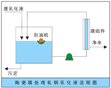 通常采用的主要處理手段是氧化氣浮破乳工藝和有機膜過濾法,氧化氣浮破乳法出水含油量高,破乳后的油不能回收,利用價值低,且達不到環保要求;有機膜處理方法設備投資大,處理成本高,運行能耗高,清洗費用大,清洗劑還造成二次污染。 公司經過長期實驗研究,開發出陶瓷膜處理軋鋼乳化液廢水技術,取得了良好的應用效果。