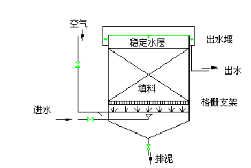 池體的作用除了進行凈化污水外,還要考慮填料,布水、布氣等設施的安裝。當池體容積較小時,可采用圓形鋼結構,池體容積較大時可采用矩形鋼筋混凝土結構。池體的平面尺寸以滿足布水、布氣均勻,填料安裝、維護管理方便為準。池體的底壁須有支承填料的框架和進水進氣管的支座。池體厚度根據池的結構強度要求來計算。高度則由填料、布水布氣層、穩定水層以及超高的高度來計算。同時,還必須考慮到充氧設備的供氣壓力或提升高度。一般總池高在