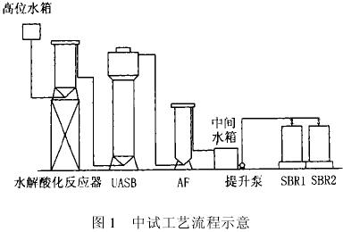 由于廢水濃度很高,且可生化性較好,因此采用厭氧-好氧處理工藝。廢水首先進入水解酸化器,在此進一步提高可生化性,同時又去除大部分懸浮物;水解酸化段的出水進入UASB反應器;經UASB反應器處理后的廢水(懸浮物含量較低),進入AF工藝;由于廢水中氨氮濃度較高,好氧處理采用了具有較強脫氮能力的SBR工藝。中試工藝流程見圖1。